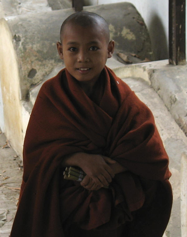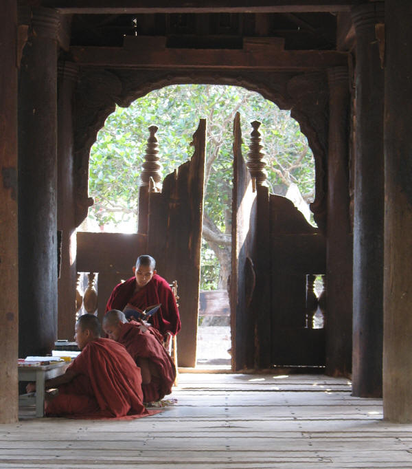 Monks study at the Bagaya Kyaung Monastery. Built entirely from teak